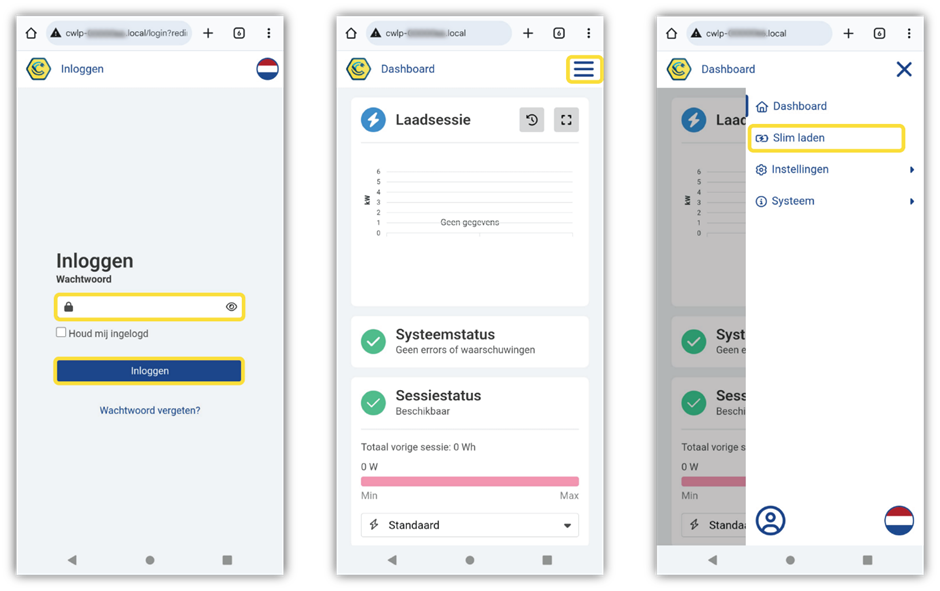 bord, vous verrez un aperçu de vos sessions de charge et l’état de votre borne. Cliquez sur les trois barres pour ouvrir le menu, puis cliquez sur «